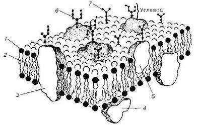 В настоящее время распространена жидкостно-мозаичная модель построения клеточной мембраны. Согласно этой модели молекулы липидов расположены в два слоя, причем своими водоотталкивающими концами (гидрофобными – жирорастворимыми) они обращены друг к другу, а водорастворимыми (гидрофильными) – к периферии. В липидный слой встроены белковые молекулы. Некоторые из них находятся на внешней или внутренней поверхности липидной части, другие – частично погружены или пронизывают мембрану насквозь.