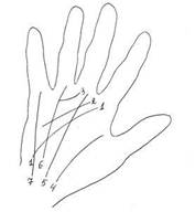 7 – продольная ульнарная борозда, от запястья к основанию 5го пальца
