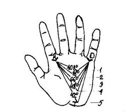 5 – продольная срединная борозда от запястья к основанию 3го пальца