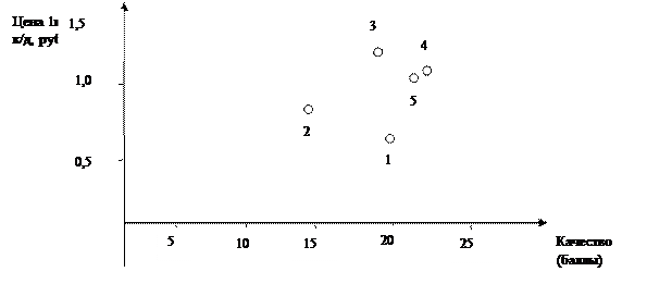 Оценивая в баллах критерии качества и соотнося их с ценой, можно оценить конкурентные позиции сравниваемых туров и построить карту стратегических групп. Методика картирования стратегических групп. Стратегическая группа состоит из организаций со сходными конкурентными стратегиями и занимаемыми на рынке позициями. Для этого выделим две группы самых важных параметров (цена — качество) и определим их значения по двум осям. Организации, оказавшиеся на полях, близких к друг другу, составляют одну стратегическую группу. Межгрупповая конкуренция тем сильнее, чем ближе группы друг к другу. Из табл. и рис. видно, что предприятия «4» и «5» составляют одну стратегическую группу, близко к ним примыкает предприятие «3». Конкуренция этих трех организаций с «1» и «2» достаточно слабая ввиду удаленности стратегических групп последних. Предприятие «Х» может приблизиться к стратегической группе трех других в случае более реальной ценовой политики как средства конкурентной борьбы.