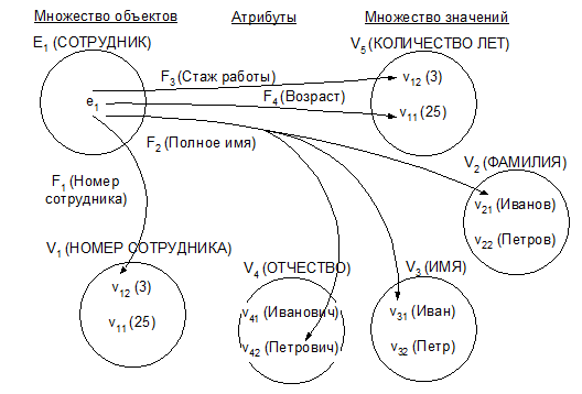 Например, рассмотрим множество сущностей СОТРУДНИК. Информация о сущностях определяется из множеств значений НОМЕР СОТРУДНИКА, ФАМИЛИЯ, ИМЯ, ОТЧЕСТВО, КОЛИЧЕСТВО ЛЕТ. Определены соответствующие атрибуты.