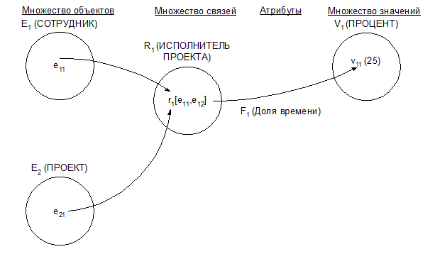 Рассмотрим следующий пример. Определены множества сущностей СОТРУДНИК и ПРОЕКТ. Между ними определяется множество связей ИСПОЛНИТЕЛЬ ПРОЕКТА. На данном множестве связей можно определить атрибут Доля времени, представляющий долю времени, выделенную конкретному сотруднику на конкретный проект. Этот атрибут отображает связь на множество значений ПРОЦЕНТ. Он не является ни атрибутом сущности СОТРУДНИК, ни атрибутом сущности ПРОЕКТ, так как его смысл зависит и от сотрудника, и от проекта.