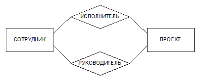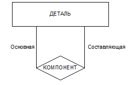 В этом случае необходимо указывать роль сущности в каждой связи. В данном примере деталь может быть основной для другой детали (например, клавиатура компьютера – основная деталь для клавиши) или может быть составной частью для другой детали (например, клавиша для клавиатуры).