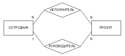 4. В диаграмме можно различать связи типа 1:N и N:N. Необходимый символ (1 или N) указывается у соответствующего множества сущностей, вовлеченного в связь.