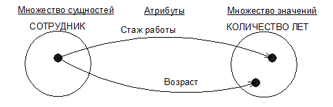 Атрибут отображает сущность из множества сущностей на множество значений. Допустимые значения определяются значениями в соответствующем множестве значений. Например, определено множество сущностей СОТРУДНИК с атрибутами Возраст и Стаж работы. Оба атрибута определены на домене КОЛИЧЕСТВО ЛЕТ, для которого определено следующее условие принадлежности: целые числа большие 0 и меньшие 90. Соответственно, значения указанных атрибутов будут черпаться из диапазона чисел 0 – 60.