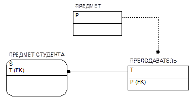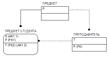 Примечание: при проектировании с использованием IDEF1x подобная ситуация выглядит следующим образом. В соответствии с заданными функциональными зависимостями определяются сущности ПРЕДМЕТ, ПРЕПОДАВАТЕЛЬ и ПРЕДМЕТ СТУДЕНТА (предмет, изучаемый студентом). Очевидно, что имеются связи типа 1:N между сущностями ПРЕДМЕТ и ПРЕПОДАВАТЕЛЬ, ПРЕДМЕТ и ПРЕДМЕТ СТУДЕНТА.