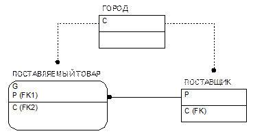 В данном примере связь между сущностями ГОРОД и ПОСТАВЛЯЕМЫЙ ТОВАР не является лишней, так как поставщик может быть дислоцирован в одном городе, а поставляемый им товар производится в другом городе. Это означает, что, по сравнению с предыдущим примером, здесь отсутствует функциональная зависимость (G, C) à P, или в сущности ПОСТАВЛЯЕМЫЙ ТОВАР нет альтернативного ключа (G, C).