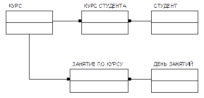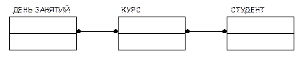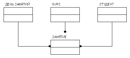 Примечание: при проектировании с использованием IDEF1x такая ситуация может возникнуть в случае, например, когда определены три сущности – КУРС, СТУДЕНТ, ДЕНЬ ЗАНЯТИЙ, и между сущностями КУРС и СТУДЕНТ, КУРС и ДЕНЬ ЗАНЯТИЙ существует связь типа N: N.