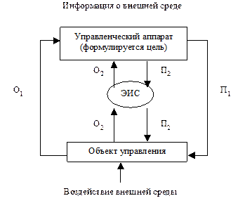 Рис. 7. Место ЭИС в контуре системы управления: П1, П2 – неформализуемая и формализуемая часть директивной информации (прямая связь); О1, О2 – неформализуемая и формализуемая часть информации обратной связи