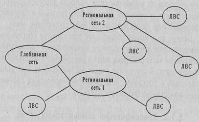 Объединение глобальных, региональных и локальных вычислительных сетей (ЛВС) позволяет создавать многосетевые иерархии. Они обеспечивают мощные, экономически целесообразные средства обработки огромных информационных массивов и доступ к неограниченным информационным ресурсам. На рис. 26 приведена одна из возможных иерархий вычислительных сетей. Локальные вычислительные сети могут входить как компоненты в состав региональной сети, региональные сети — объединяться в составе глобальной сети и, наконец, глобальные сети могут также образовывать сложные структуры.
