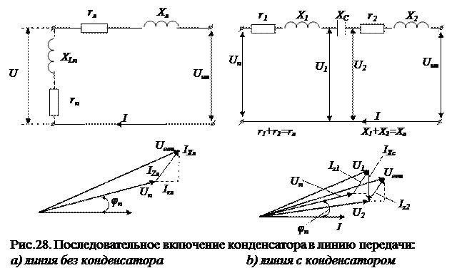 Последовательное включение конденсаторов в линию электропередач используется для компенсации реактивного падения напряжение в линии электропередач, повышения пропускной способности линии, для уменьшения влияния толчков тока на стабильность напряжения в распределительных линиях при включении мощных приемников. Регулирующее действие последовательно включенных конденсаторов, пропорциональное току в линии, происходит мгновенно. Схема последовательного включения конденсатора и изменение векторной диаграммы после включения конденсатора показаны на рис. 28.