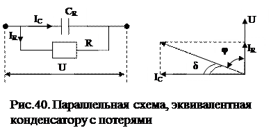 Реальный конденсатор с потерями можно заменить эквивалентной схемой, последовательной (рис. 39) или параллельной (рис. 40).