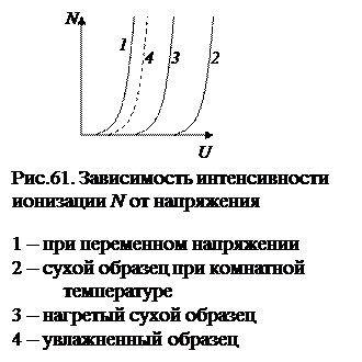 снижается (при отсыревании или нагревании конденсатора), то количество вспышек ионизации в единицу времени резко возрастает и интенсивность может быть такой же как и при переменном напряжении. Обычно напряжение ионизации при постоянном напряжении больше напряжения ионизации при переменном напряжении, то есть: