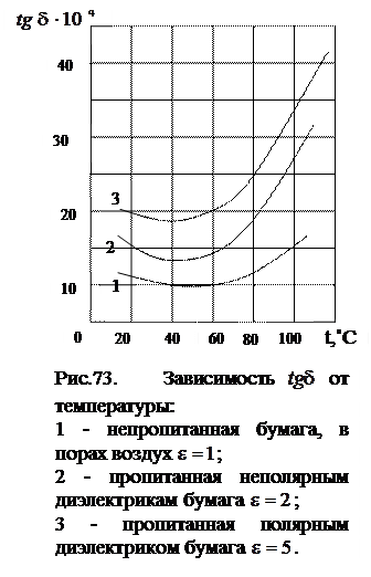 Зависимость угла потерь конденсаторной бумаги от температуры при частоте 50 Гц при различной диэлектрической проницаемости вещества, заполняющего поры в бумаге изображена на рис.73.