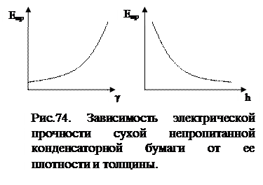 С ростом плотности бумаги электрическая прочность растет. С увеличением толщины бумаги электрическая прочность падает (рис.74).
