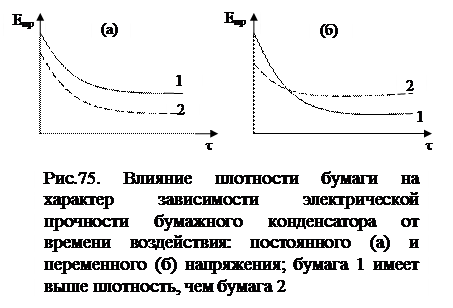 будет определяться значениями проводимостей. Проводимость пропиточных масс обычно выше, чем клетчатки, поэтому основная доля напряжения приходится на волокна клетчатки. При постоянном напряжении бумага с большей плотностью сохраняет свое преимущество перед бумагой с меньшей плотностью, как при кратковременном, так и при длительном воздействии напряжения (рис.75).