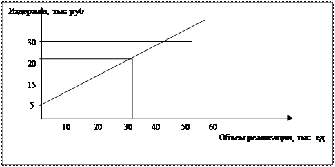 При графическом способе отбираются два уровня издержек - в высшей и низшей точках релевантного ряда. Например, общая величина издержек 20 тыс. р. при 30 тыс. ед. изделий (минимальная граница релевантного ряда) и 30 тыс. р. при 50 тыс. ед. изделий (максимальная граница релевантного ряда). На основании этого ряда строим график (рис. 1), где искомой величиной является сумма постоянных и переменных издержек.