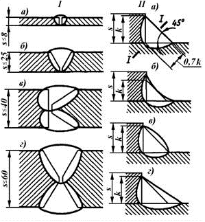 По форме поперечного сечения сварные швы делятся на стыковые (рис. 35, I) и угловые (рис. 35, II). Кроме того, поперечное сечение шва зависит от формы подготовки кромок под сварку. Так, например, в стыковых соединениях применяются швы с отбортовкой кромок, без скоса кромок (рис. 35, Iа), с V -образной разделкой кромок (рис. 35, Iб) с K -образной разделкой кромок (рис. 35, Iв) X -образной разделкой кромок (рис. 35, Iг). Швы с разделкой кромок применяются и в других видах соединений. Форма разделки кромок зависит от толщины свариваемого металла, от вида сварки (ручная или автоматическая), от способа защиты расплавленного металла от окисления (сварка под слоем флюса, сварка в среде защитных газов и т.п.) и некоторых других факторов. Для наиболее распространённых видов сварки (ручная плавящимся электродом, полуавтоматическая и автоматическая под слоем флюса и др.) разделка кромок стандартизована.