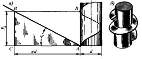 Рис. 38. Образование винтовой линии (а) и треугольной резьбы (б).