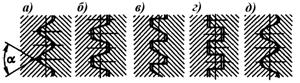 Рис. 39. различные профили резьб: а – треугольный; б – трапециедальный; в – упорный; г - прямоугольный; д - круглый.