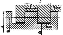 Прямоугольная резьба (рис. 44) в сечении имеет форму прямоугольника. Эта резьба не стандартизована, легко изготавливается на токарно-винторезных станках, но неудобна для массового производства. Углы во впадинах являются сильными концентраторами напряжений, что резко снижает усталостную прочность винта. По этой причине резьба применяется ограниченно в малонагруженных передачах.