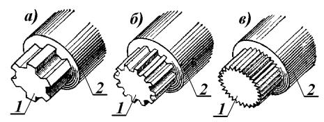 Рис. 43. Шлицевое соединение: а) прямобочными шлицами; б) эвольвентными шлицами; в) треугольными шлицами; 1 – вал, 2 – ступица.
