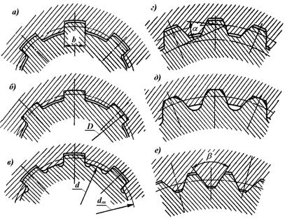 Рис. 44. Типы и центрирование зубчатых соединений: прямобочные: а) по боковым поверхностям b; б) по наружному диаметру D; в) по внутреннему диаметру d; эвольвентные – г) по боковым поверхностям; д) по наружному диаметру; треугольные: е) центрируются только по боковым поверхностям.
