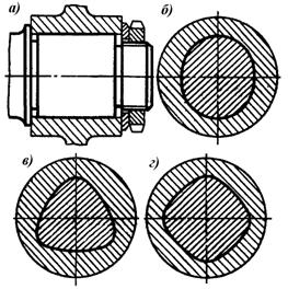 Рис. 45. Профильное соединение: а) продольное сечение; б), в), г) возможные поперечные сечения: овальное, треугольное, квадратное.