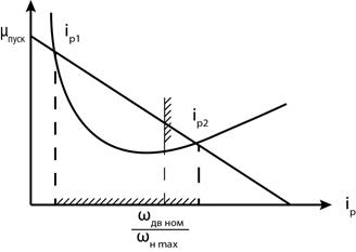 Совместное решение (3) и (4) позволяет определить возможный диапазон передаточных чисел редуктора при которых момент, развиваемый двигателем превышает требуемый момент со стороны нагрузки. Покажем это графически: