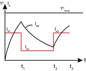 Из рисунка видно, что максимальная температура нагрева двигателя зависит не только от величины момента нагрузки (тока якоря), но и от интервала времени действия такого момента. Для синусоидальной нагрузки учитывается среднеквадратическое значение момента нагрузки. То же самое и для тока якоря.