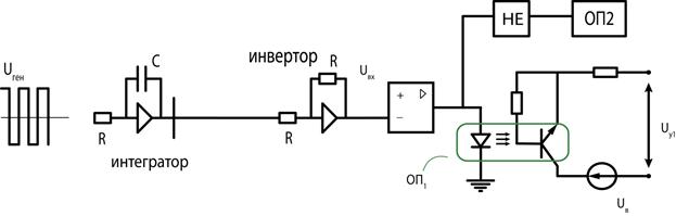 Широтно-модулированные импульсы подаются на светодиоды оптопары. Для обеспечения требуемого закона модуляции управляющих напряжений ключей моста применяется инвертирование. Опорное напряжение инвертируется инвертором на операционном усилителе ОУ2, а выходные сигналы компараторов логическими элементами «НЕ».