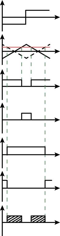 Временные диаграммы иллюстрируют этот эффект. Отметим, что частота следования токовых импульсов получается в два раза выше чем частота импульсов, задаваемая генератором. В этом несложно убедиться, если построить временные диаграммы для всех управляющих сигналов на одном графике, как это приводится в методических указаниях по курсовому проектированию.