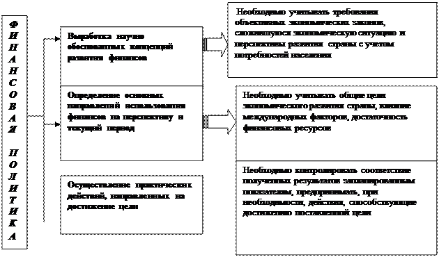 Финансовая политика государства призвана обеспечивать нормальное функционирование финансовой системы общества и на этой основе эффективно осуществлять свои функции – экономические, социальные, экологические, оборонные и др. Следовательно, финансовая политика является частью экономической политики государства. В ней конкретизируются главные направления развития народного хозяйства, определяется общий объем финансовых ресурсов, их источники и направления использования, разрабатывается механизм регулирования и стимулирования социально-экономических процессов. В то же время финансовая политика – относительно самостоятельная сфера деятельности государства, важнейшее средство реализации политики государства в любой области общественной деятельности.