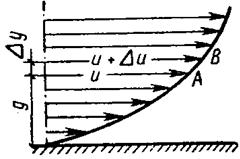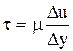 Рассматривая два слоя жидкости А и В, расположенных друг от друга на расстоянии Dy, нетрудно видеть, что значение их скоростей отличается на величину Du. Величина Du за единицу времени представляет собой абсолютный сдвиг слоя В по слою А, а отношение Du/Dy представляет градиент скорости или относительный сдвиг. Силу трения на единицу площади, представляющую величину касательного напряжения t, можно определить, как