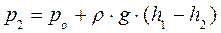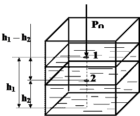 Для того, чтобы определить давление в произвольной точке покоящейся жидкости, достаточно знать давление в какой-либо другой точке, принадлежащей этому же объему, а также глубину погружения одной точки относительно другой. Пусть в открытом сосуде находится жидкость в состоянии покоя. На ее поверхность, и, следовательно, на точку 1 действует атмосферное давление р О. Определим абсолютное давление р2, действующее на точку 2 внутри жидкости. Очевидно, что оно будет равно сумме атмосферного давления и давления столба жидкости над точкой 2: