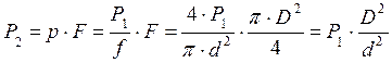 Согласно закону Паскаля давление, развиваемое силой Р1, передается на рабочий поршень, создавая полезную силу Р2, равную: