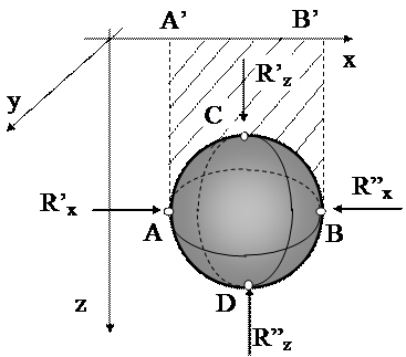 Контурной линией АB разделим тело на две части – верхнюю и нижнюю. На верхнюю часть жидкость давит с силой R’Z, на нижнюю – R”Z.