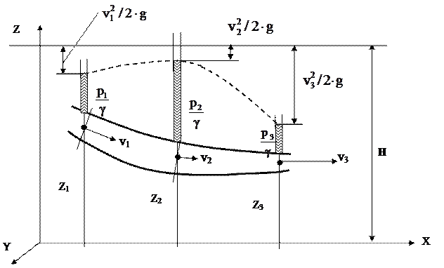Вышеприведенный рисунок дает геометрическое истолкование уравнения Бернулли. Можно видеть, как по длине струйки меняются слагаемые этого уравнения. Если сечение расширяется, и, следовательно, скорость уменьшается, то уменьшается скоростной напор, но возрастает сумма