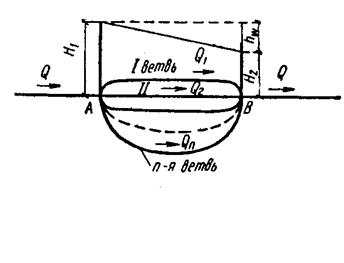 Основной задачей при расчете трубопровода с параллельным соединением является определение расходов Q1, Q2,... Qn параллельных труб и перепада напора между точками А и В. Считаются известными: Q - общий расход, диаметры и длины параллельных труб (d1, d2,... dn и l1, l2... ln). Поскольку потеря напора для каждой параллельной ветки одна и та же hw1 = hw2 = hwi = hw = H1 - H2, то для первой ветви можно написать