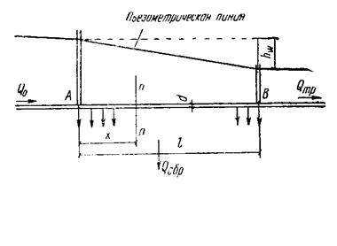 Решение задачи сводится к определению величины потерянного напора. Решение задачи проводим в приближении Дюпюи. Пусть на участке АВ имеет место непрерывный отток величиной q на единицу длины трубы. Если расход трубопровода в точке А равен Q0, а длина участка, на котором происходит раздача l, сбросный расход Qсбр = ql, транзитный расход, остающийся в трубопроводе после точки В Qтр = Q0 - ql. В сечении n-n на расстоянии х от узла А расход определится, как