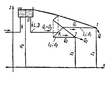 Основными задачами расчета можно считать: определение кольцевых расходов Q1 и Q2 при заданном напоре в начальном сечении или определение напора при заданных кольцевых расходах Q1 и Q2. Составим уравнение Бернулли для потока по линии от начального сечения магистральной трубы до выходного сечения первой ветви (вдоль линии 0 - А - 1), а затем до выходного сечения второй ветви (вдоль линии 0 - А - 2).