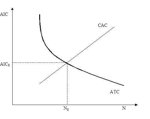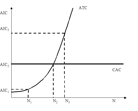 В таком случае кривые спроса и предложения институтов меняют свою форму и наклон. Кривая предложения (или кривая издержек коллективного действия, т.е. общественных издержек на создание институтов, collective action cost – СAC) становится горизонтальной, т. к. создание института сопряжено с фиксированными затратами на поддержание государственного аппарата. Кривая спроса (или кривая совокупных трансакционных издержек – aggregate transaction cost – АТС) принимает положительный наклон вследствие распределительной природы создаваемых институтов. Поэтому при увеличении количества включенных в сферу его действия индивидов (N) их сравнительные выгоды снижаются из-за роста трансакционных издержек, блокирующих вход к распределению тех или иных благ[78].