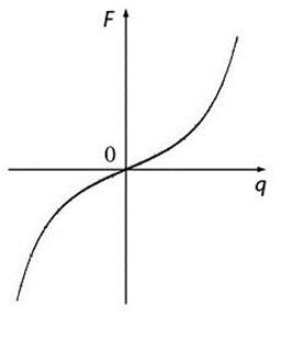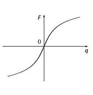 Нелинейность механических систем проявляется в случаях, когда упругая восстанавливающая сила нелинейно зависит от смещения точек системы от положения равновесия. Иногда это связано с характеристиками применяемых материалов, например, резина или кожа имеют жесткую характеристику, вид которой показан на рис. 1. Чугун и бетон, наоборот, имеют характеристику мягкую, см. рис. 2. Часто в машинах применяются пружины (рессоры) коэффициент жесткости которых зависит от деформации. Применяются также соединительные элементы (муфты) со специальными нелинейными характеристиками. Весьма распространены нелинейности, носящие технологический характер, например, зазоры в зубчатых и шлицевых соединениях.
