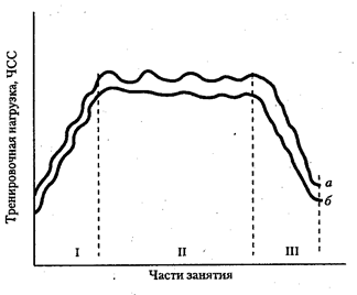 | Рис. 6.1. Структура тренировочного занятия. Кривые тренировочной нагрузки с простой (а) и сложной (б) основной частью: / — разминка (подготовительная часть); // — основная часть; III— заключительная часть |