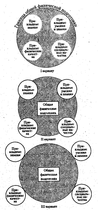 | Рис. 10.1. Схема вероятных вариантов соотношений общей физической подготовки и ППФП в процессе физического воспитания студентов, обучающихся по различным специальностям. |