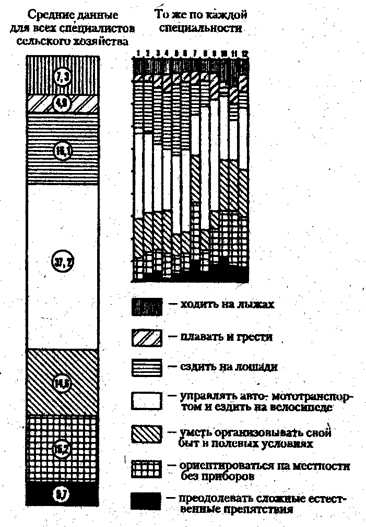 Другой пример. При проведении конкретного социологического исследования (более 10 000'респондентов) в области сельского хозяйства были выявлены наиболее важные прикладные умения и навыки и проведено их ранжирование для всех специалистов и для представителей отдельных профессий. Исследование позволяет определить прикладные умения и навыки как в общеотраслевом масштабе, так и для конкретного содержания ППФП студентов отдельного факультета (рис. 10.5).