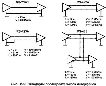 На физическом уровне последовательный интерфейс имеет различные реализации, различающиеся способом передачи электрических сигналов. Существует ряд родственных международных стандартов: RS-232C, RS-423A, RS-422A и RS-485. На рис. 2.2 приведены схемы соединения приемников и передатчиков, а также показаны ограничения на длину линии (L) и максимальную скорость передачи данных (V).