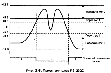 Стандарт RS-232C использует несимметричные передатчики и приемники — сигнал передается относительно общего провода — схемной земли (симметричные дифференциальные сигналы используются в других интерфейсах — например, RS-422). Интерфейс НЕ ОБЕСПЕЧИВАЕТ ГАЛЬВАНИЧЕСКОЙ РАЗВЯЗКИ устройств. Логической единице соответствует напряжение на входе приемника в диапазоне -12...-3 В. Для линий управляющих сигналов это состояние называется ON («включено»), для линий последовательных данных — MARK. Логическому нулю соответствует диапазон +3...+12 В. Для линий управляющих сигналов состояние называется OFF («выключено»), а для линий последовательных данных — SPACE. Диапазон -3...+3 В — зона нечувствительности, обусловливающая гистерезис приемника: состояние линии будет считаться измененным только после пересечения порога (рис. 2.5). Уровни сигналов на выходах передатчиков должны быть в диапазонах -12...-5 В и +5...+12 В для представления единицы и нуля соответственно. Разность потенциалов между схемными землями (SG) соединяемых устройств должна быть менее 2 В, при более высокой разности потенциалов возможно неверное восприятие сигналов. Интерфейс предполагает наличие ЗАЩИТНОГО ЗАЗЕМЛЕНИЯ для соединяемых устройств, если они оба питаются от сети переменного тока и имеют сетевые фильтры.