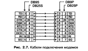 Аппаратный протокол удобно использовать при подключении принтеров и плоттеров, если они его поддерживают (рис. 2.10). При непосредственном (без модемов) соединении двух компьютеров аппаратный протокол требует перекрестного соединения линий RTS — CTS.