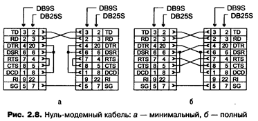 Если аппаратура АПД соединяется без модемов, то разъемы устройств (вилки) соединяются между собой нуль-модемным кабелем (Zero-modem или Z-modem), имеющим на обоих концах розетки, контакты которых соединяются перекрестно по одной из схем, приведенных на рис. 2.8.
